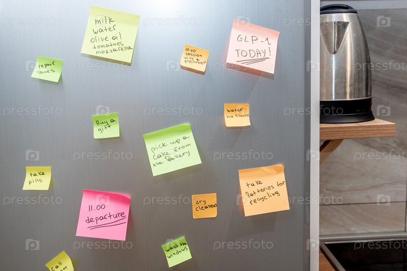 Цветные наклейки приклеены к холодильнику расписание дела дня, детали интерьера