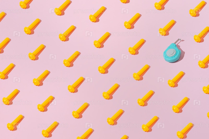Творческий абстрактный шаблон винтовки и измерительной ленты плоский на розовом фоне