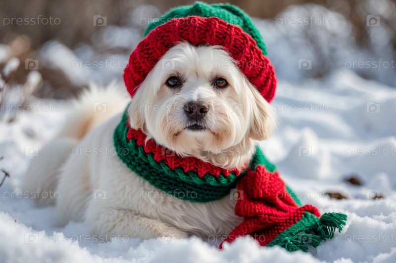 AI Generative Портрет собаки в вязанной зимней одежде шляпы и шарфа, животное в снежных дождях зимой