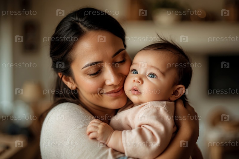 ИИ генеративный семейный портрет Мама и новорожденный ребенок, женщина и ребенок обнимаются в гостиной дома