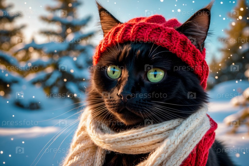 AI Generative Портрет кошки в вязанной зимней одежде шляпе и шарфе, животное в снежных дождях зимой