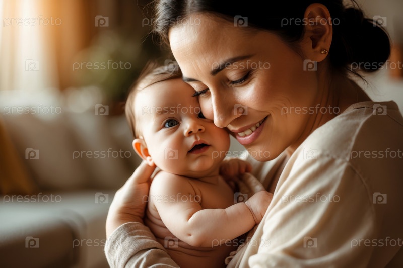 ИИ генеративный семейный портрет Мама и новорожденный ребенок, женщина и ребенок обнимаются в гостиной дома