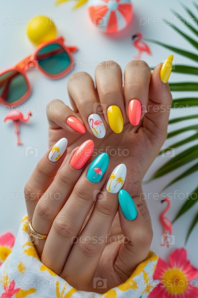 ИИ генеративный тематический летний маникюр в ярко-синем, розовом и желтом цветах с праздничными узорами
