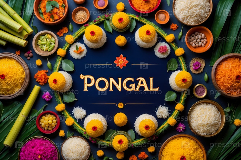 Pongal Traditional India festive Holiday Greeting Card on Colored Background with Food AI Generative Праздничная традиционная индийская праздничная открытка на цветном фоне с продуктами питания