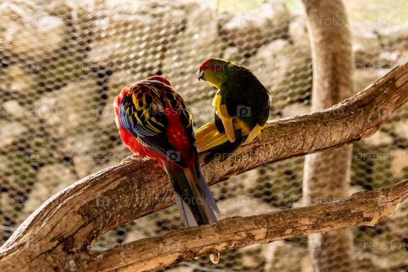 Экзотические попугаи в птичьей клетке на ферме, питомцы тропических домашних птиц летают снаружи