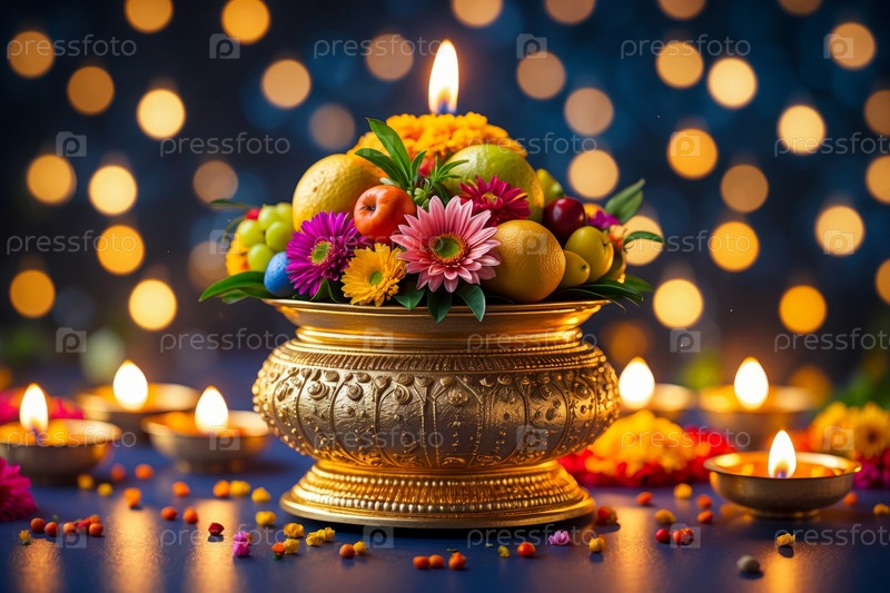 Натурморт традиционная еда, свечи и цветы карта Ugadi Yugadi Новый год праздник ИИ генеративный