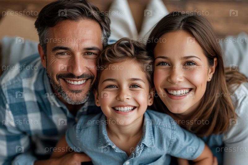 Семейный портрет Мама, папа и ребенок, Женщина, мужчина и ребёнок обнимаются в гостиной дома AI Generative