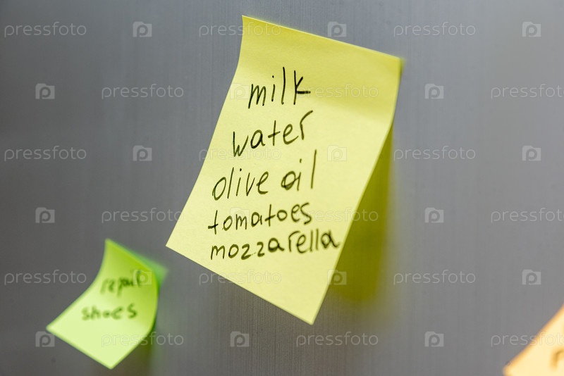 Наклейка напоминания, приклеенная к двери холодильника продуктовый магазин магазины покупки список еды