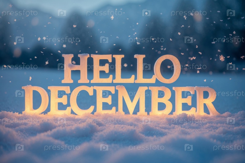 Баннер поздравительной открытки с надписью Здравствуйте, декабрь на фоне снежного леса AI Generative