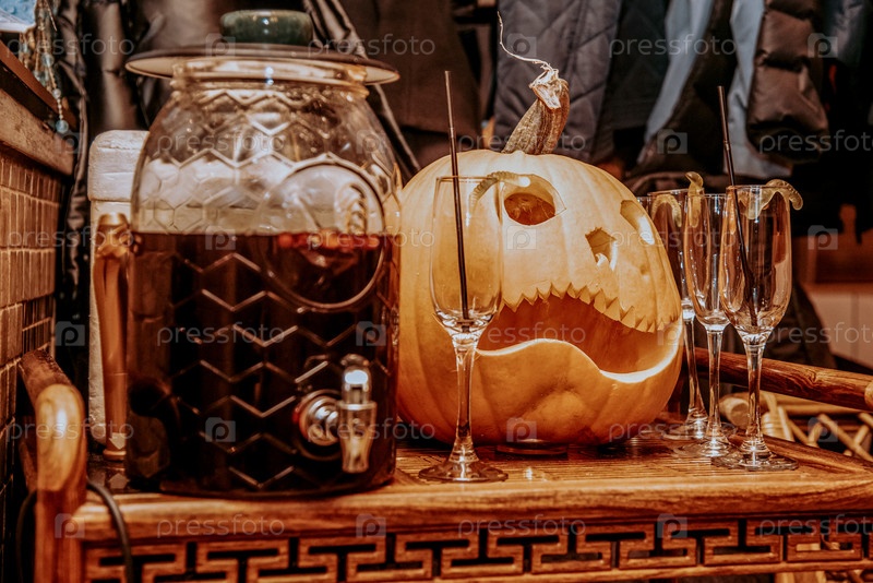 Кровавый жуткий алкогольный коктейль на Хэллоуин с тыквенным фонарем в фоне