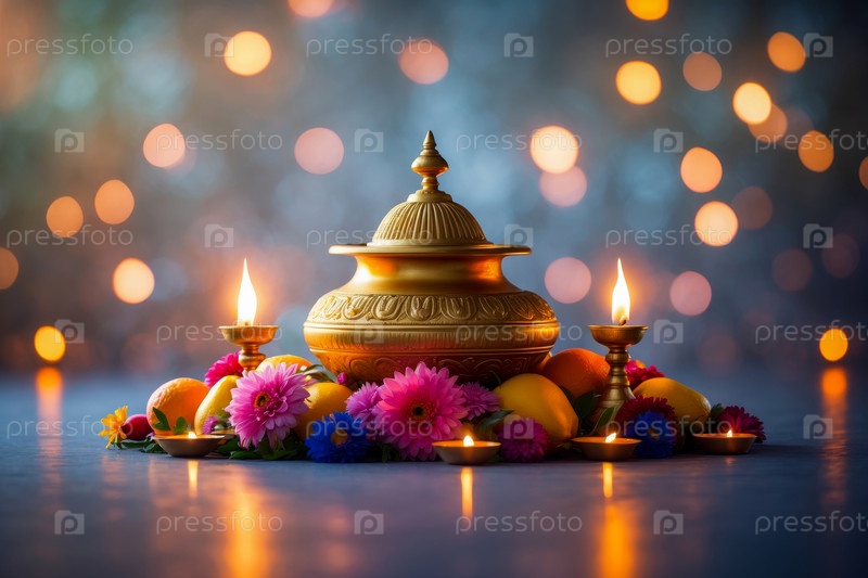 Натурморт традиционная еда, свечи и цветы карта Ugadi Yugadi Новый год праздник ИИ генеративный