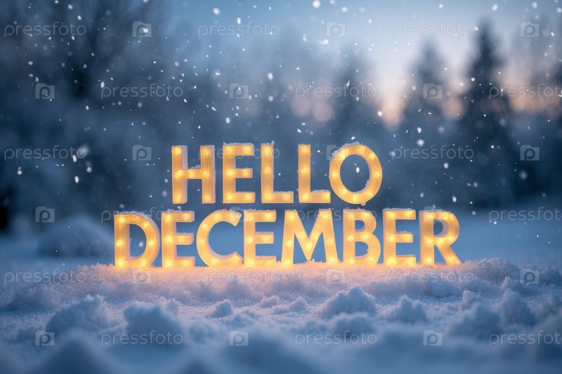 Баннер поздравительной открытки с надписью Здравствуйте, декабрь на фоне снежного леса AI Generative