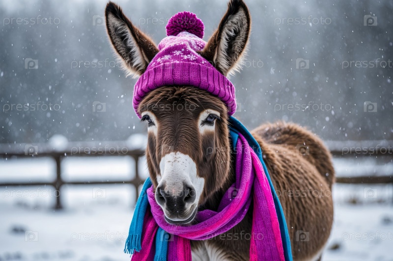 Портрет осла в вязанной зимней одежде шляпы и шарфа, животное во снежном снегу зимой AI Generative
