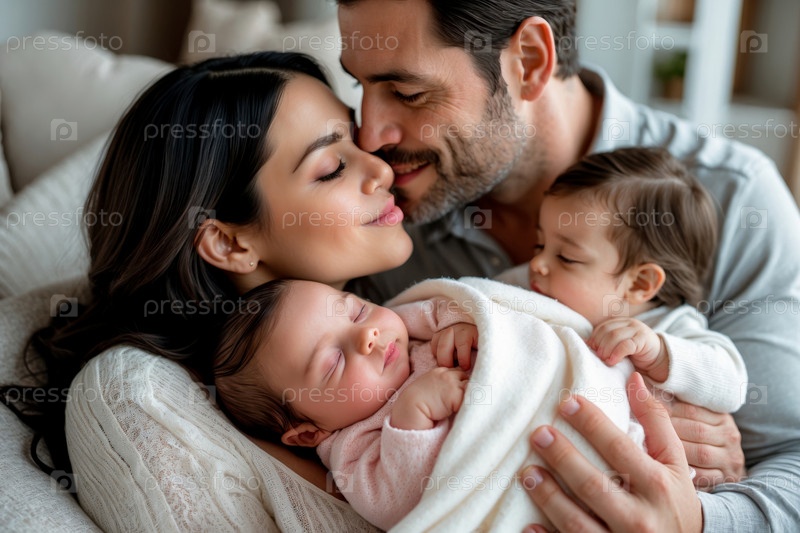 Генеративный семейный портрет мамы, папы и новорожденного ребенка, женщина, мужчина и ребенок обнимаются в гостиной дома