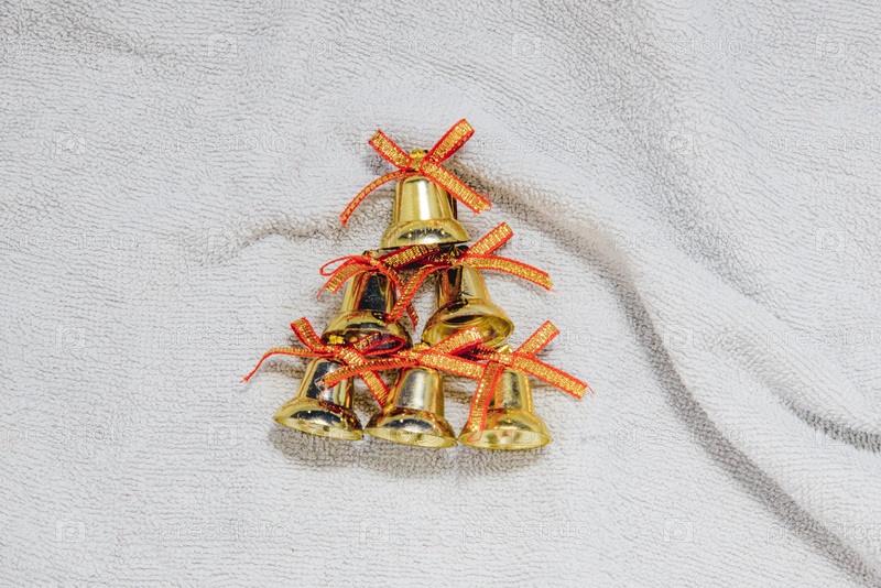 Рождественские новогодние колокола украшены красной лентой на фоне белого ткани