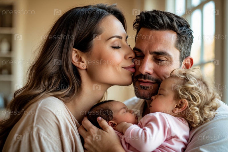 Семейный портрет Мама, папа и новорожденный ребенок, женщина, мужчина и ребёнок обнимаются Гостиная Дом AI Generative
