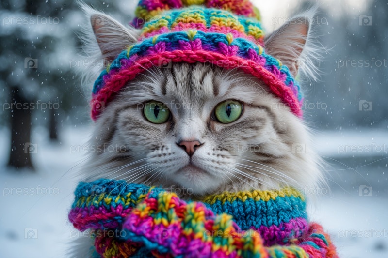 AI Generative Портрет кошки в вязанной зимней одежде шляпе и шарфе, животное в снежных дождях зимой