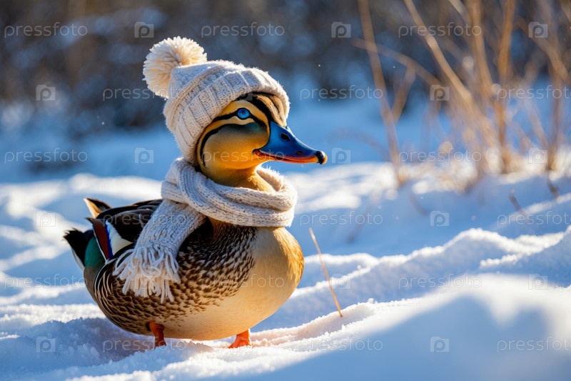 ИИ генеративный портрет утки в вязанной зимней одежде шляпа и шарф, животное во снежных дождях зимой