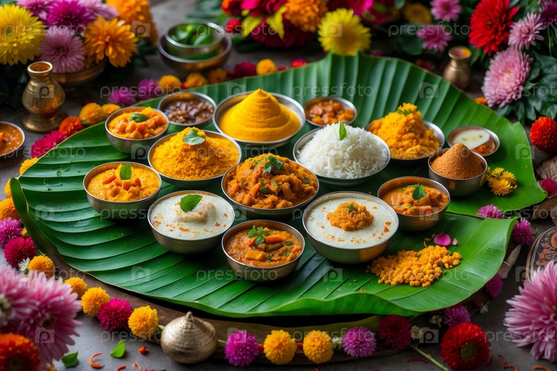 Понгал Традиционная индийская праздничная еда, украшенный обеденный стол Индийские блюда кухня AI Generative