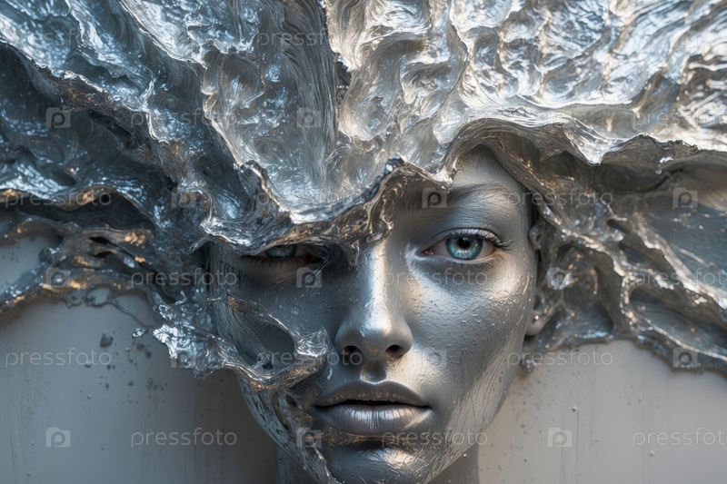 Женское лицо, покрытое серебряной краской крупный план женской красоты