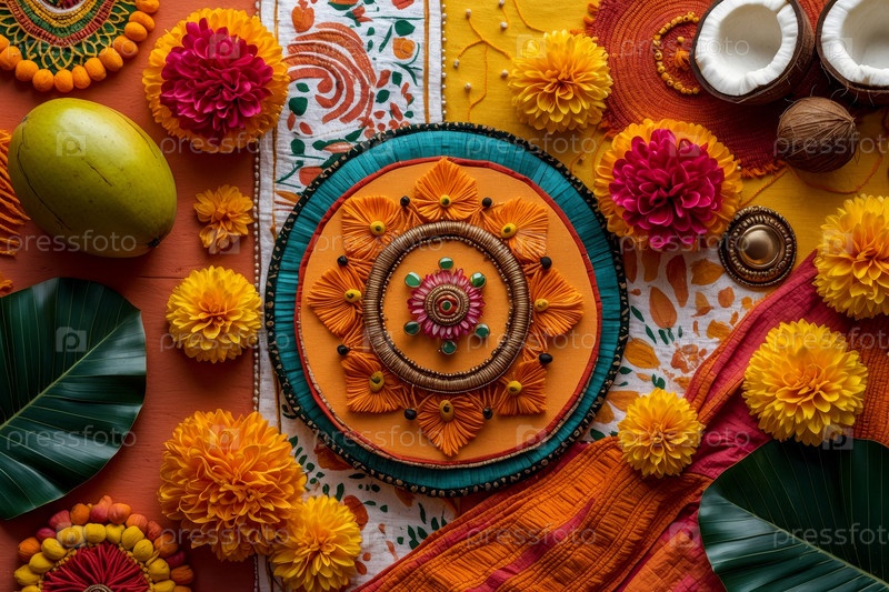 Натурморт традиционная еда, свечи и цветы карта Ugadi Yugadi Новый год праздник ИИ генеративный
