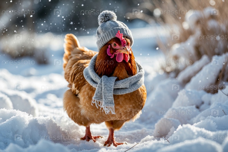 AI Generative Портрет курицы в вязанной зимней одежде шляпе и шарфе, животное в снежных дождях зимой