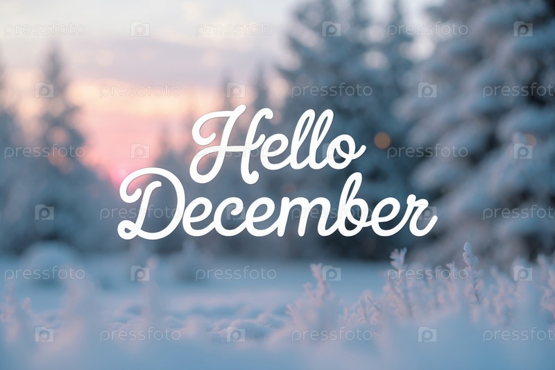 Баннер поздравительной открытки с надписью Здравствуйте, декабрь на фоне снежного леса AI Generative