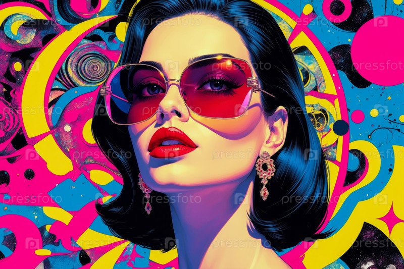 AI Generative Поп-арт портрет молодой улыбающейся красивой женщины в солнцезащитных очках на цветном фоне