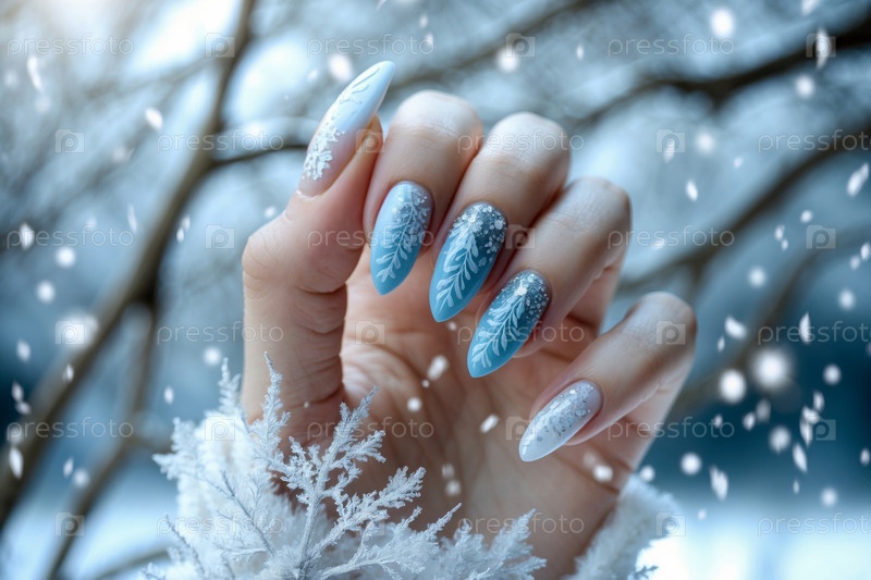 Тематический зимний маникюр в ярко-синих и белых цветах с праздничными снежными узорами AI Generative