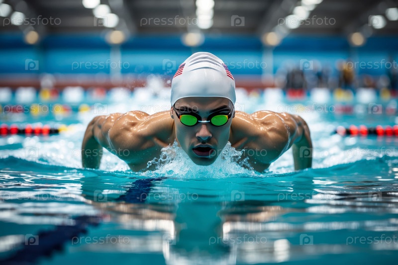 Мужской спортсмен пловчик плавание скоростная гонка в бассейне, летние Олимпийские игры соревнования AI Generative