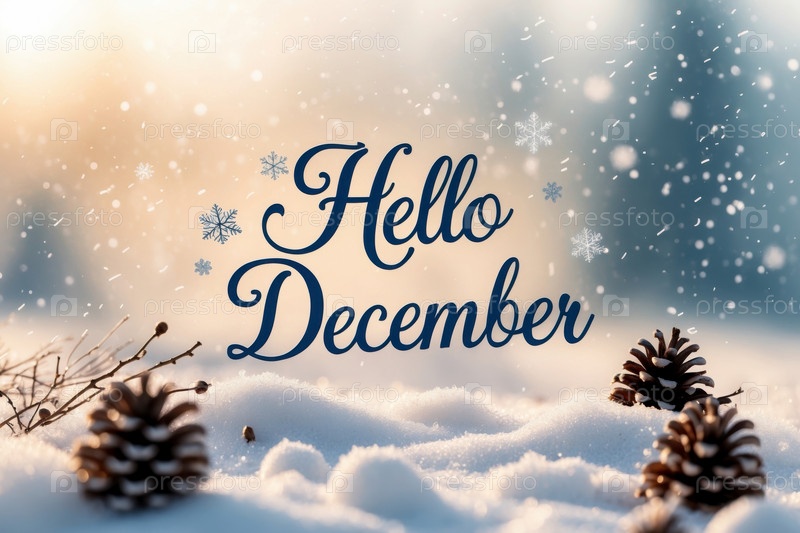 Баннер поздравительной открытки с надписью Здравствуйте, декабрь на фоне снежного леса AI Generative