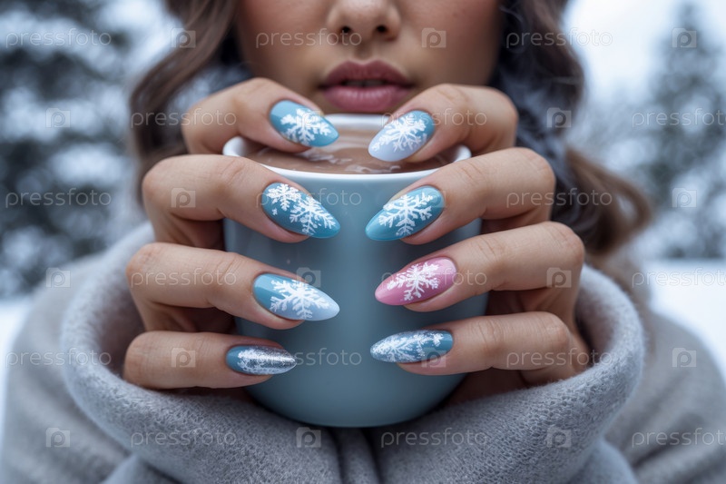Тематический зимний маникюр в ярко-синих и белых цветах с праздничными снежными узорами AI Generative