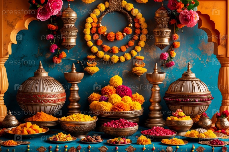 Понгал Традиционная индийская праздничная еда, украшенный обеденный стол Индийские блюда кухня AI Generative