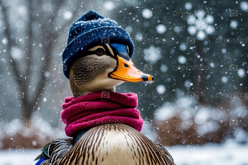 ИИ генеративный портрет утки в вязанной зимней одежде шляпа и шарф, животное во снежных дождях зимой