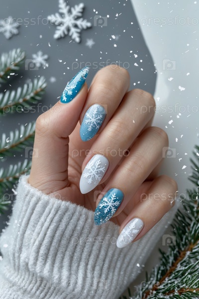 Тематический зимний маникюр в ярко-синих и белых цветах с праздничными снежными узорами AI Generative