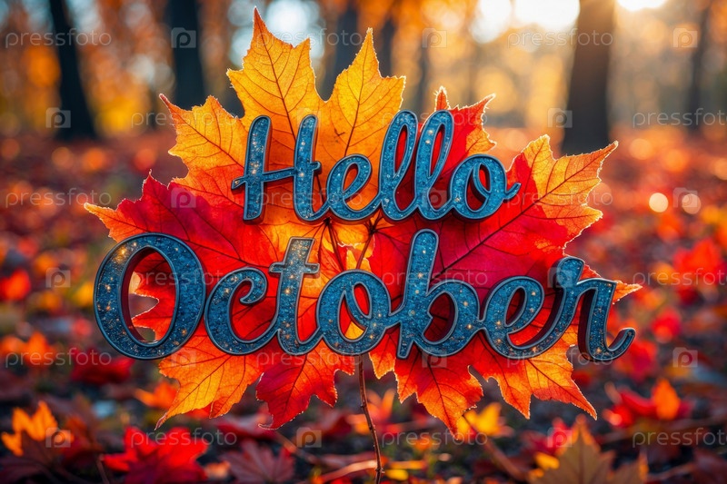 Карточная надпись Привет октябрь осень осенний фон желтый красный листья лист падение AI Generative