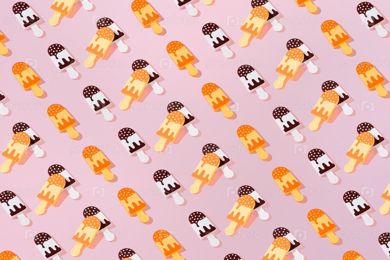 Креативный рисунок шоколадного и ванильного мороженого Popsicle на палочке на пастельно-розовом фоне