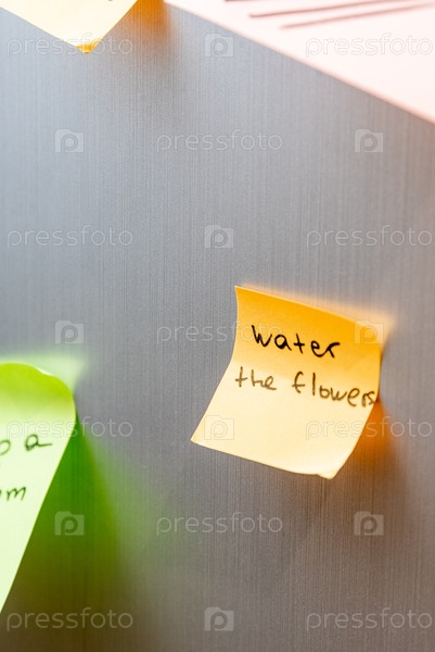 Наклейка напоминания, приклеенная к двери холодильника для полива цветочного растения домашние дела