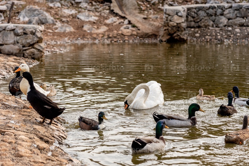Утки и белые лебеди плавают в прудовом озере, водные птицы фермы животные гуляют на открытом воздухе