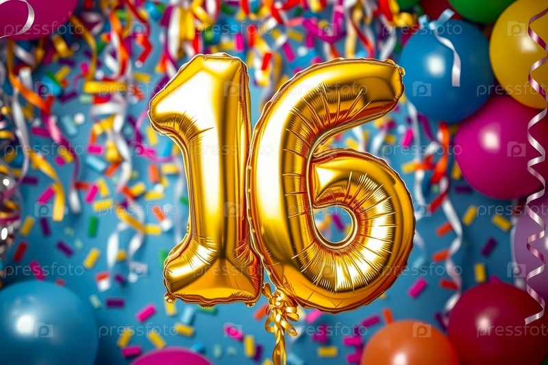 Гелиевый день рождения шарик формы номер шестнадцать, золотые буквы фигура 16 праздник праздничный фон