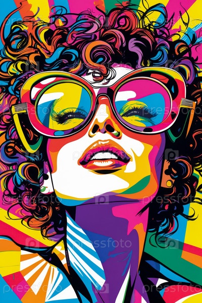 AI Generative Поп-арт портрет молодой улыбающейся красивой женщины в солнцезащитных очках на цветном фоне