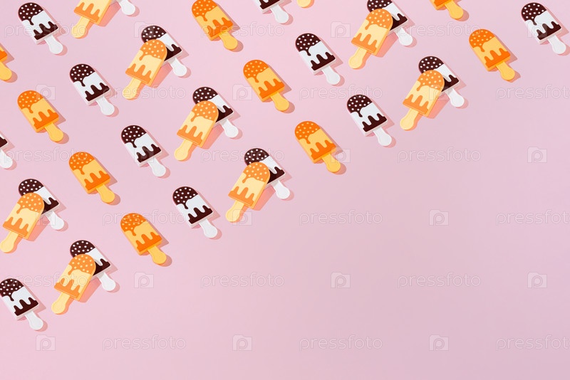 Креативный рисунок шоколадного и ванильного мороженого Popsicle на палочке на пастельно-розовом фоне с копировальным пространством для текстового минимализма