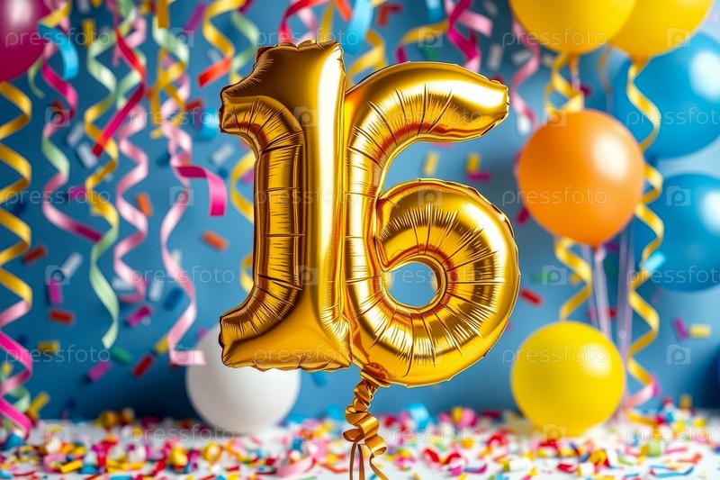 Гелиевый день рождения шарик формы номер шестнадцать, золотые буквы фигура 16 праздник праздничный фон