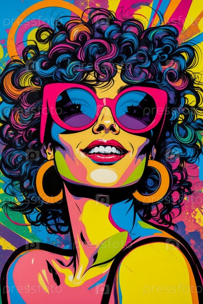 AI Generative Поп-арт портрет молодой улыбающейся красивой женщины в солнцезащитных очках на цветном фоне