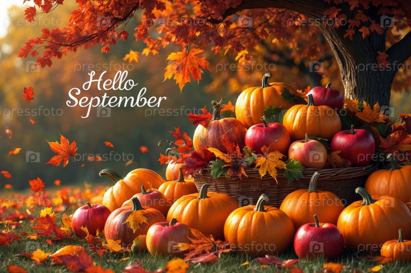 AI Generative Поздравление с надписью Привет, сентябрь осень-осень на фоне желтых и красных листьев листопад