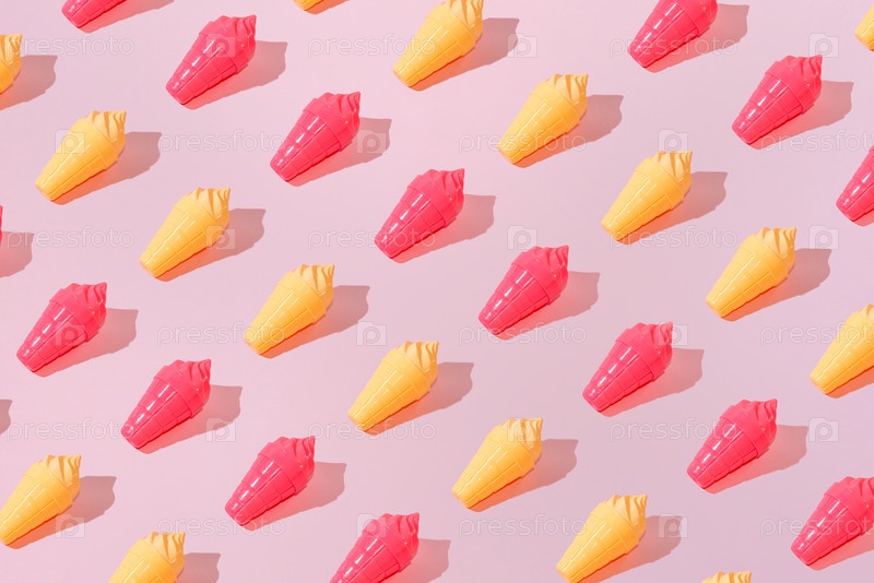 Креативный образец мороженого ванильная и клубничный конус пастельный розовый фон
