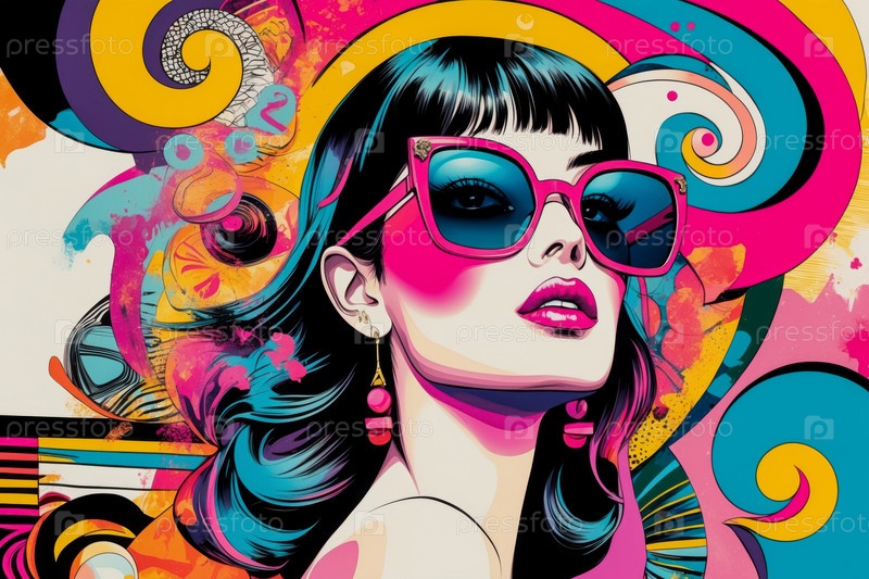 AI Generative Поп-арт портрет молодой улыбающейся красивой женщины в солнцезащитных очках на цветном фоне