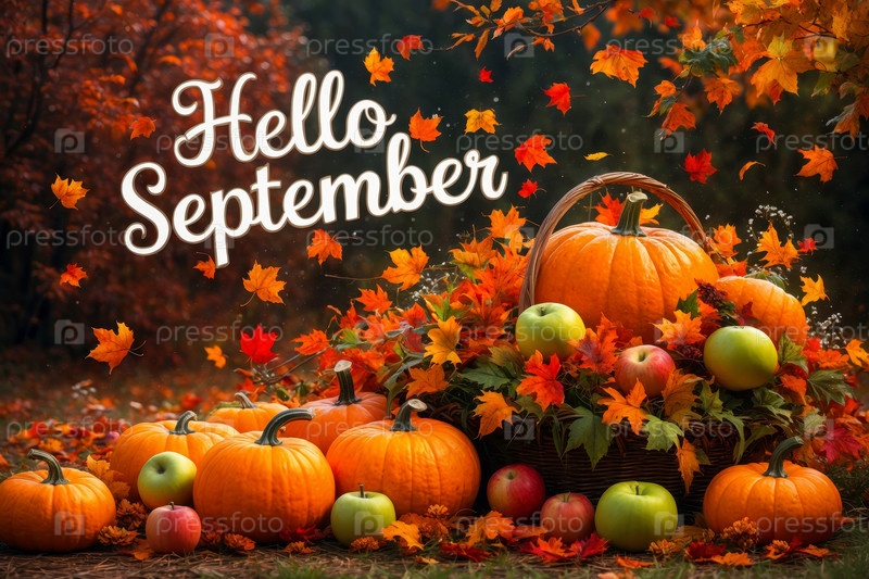Карточная надпись Привет сентябрь осень-осень фон желтый красный листья лист осенний AI Generative
