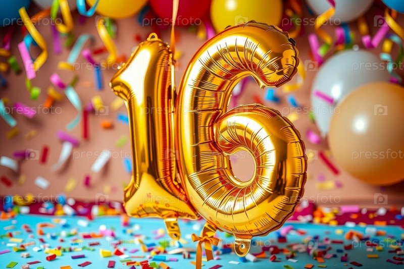 Гелиевый день рождения шарик формы номер шестнадцать, золотые буквы фигура 16 праздник праздничный фон
