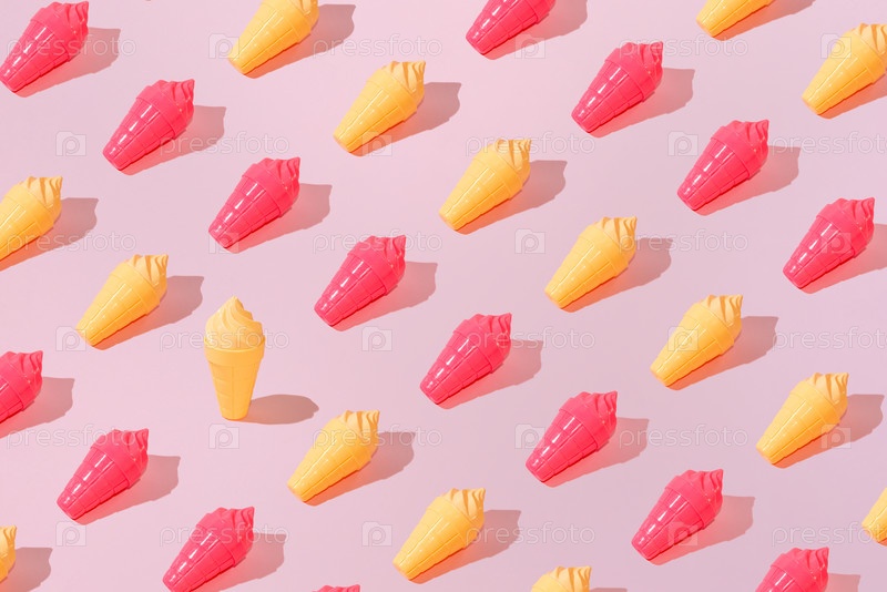 Креативный образец мороженого ванильная и клубничный конус пастельный розовый фон